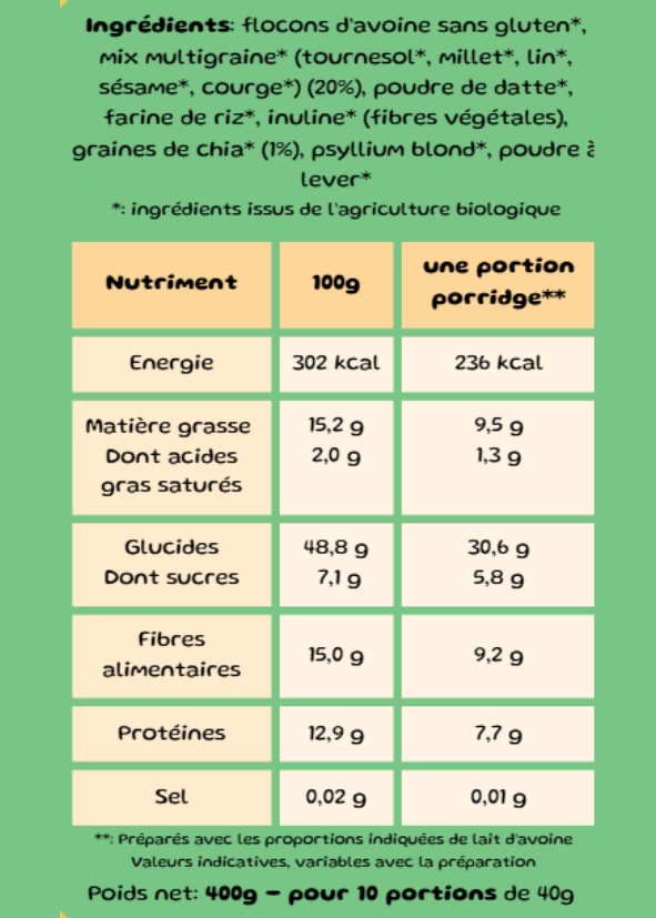 Multigraines :flocons d’avoine sans gluten*, mix multigraine* (tournesol*, millet*, lin*, sésame*, courge*) (20%), poudre de datte*, farine de riz*, inuline* (fibres végétales), graines de chia* (1%), psyllium blond*, poudre à lever*